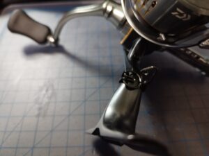 通常売っているフックキーパーってロッドにゴムで固定してつけるものがほとんどだと思うのですがスピニングリールを操作しているときにラインがよく絡まってしまうことが多いんですよね。。。